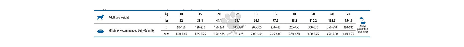 Аналитични съставки: суров протеин 28.00%; сурова мазнина 18.00%; сурови влакнини 2.90%; сурова пепел 8.60%; калций 1.10%; фосфор 0.80%; омега-3 мастни киселини 0.90%; омега-6 мастни киселини 3.30%; EPA 0.30%; DHA 0.50%; глюкозамин 1200mg/kg; хондроитин сулфат 900mg/kg.