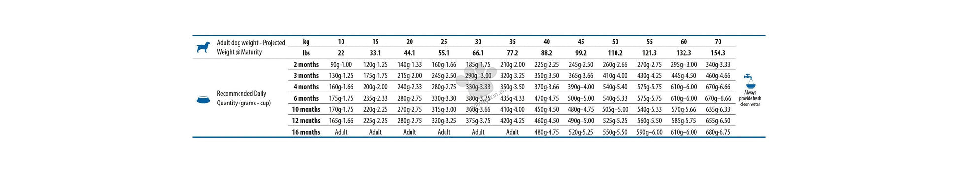 Аналитични съставки: суров протеин 30.00%; сурова мазнина 20.00%; сурови влакнини 2.50%; сурова пепел 8.10%; калций 1.10%; фосфор 0.91%; омега-3 мастни киселини 0.90%; омега-6 мастни киселини 3.40%; EPA 0.30%; DHA 0.50%; глюкозамин 1400mg/kg; хондроитин сулфат 1100mg/kg.