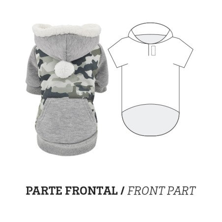 1. Камуфлажният кучешки суитшърт е идеалната дреха, за да поддържа вашия пухкав приятел едновременно топъл и стилен. С качулка и мека поларена подплата от вътрешната страна, този суитшърт е перфектен за студено време. Камуфлажният принт, комбиниран със сиво, придава модерен акцент. Моделът е напълно адаптивен, с отвор за каишка и ластик при опашката, което осигурява отлично прилягане. Благодарение на удобния джоб, този суитшърт е не само функционален, но и модерен. Вашият любимец ще се чувства комфортно и ще изглежда чудесно на всяка разходка.