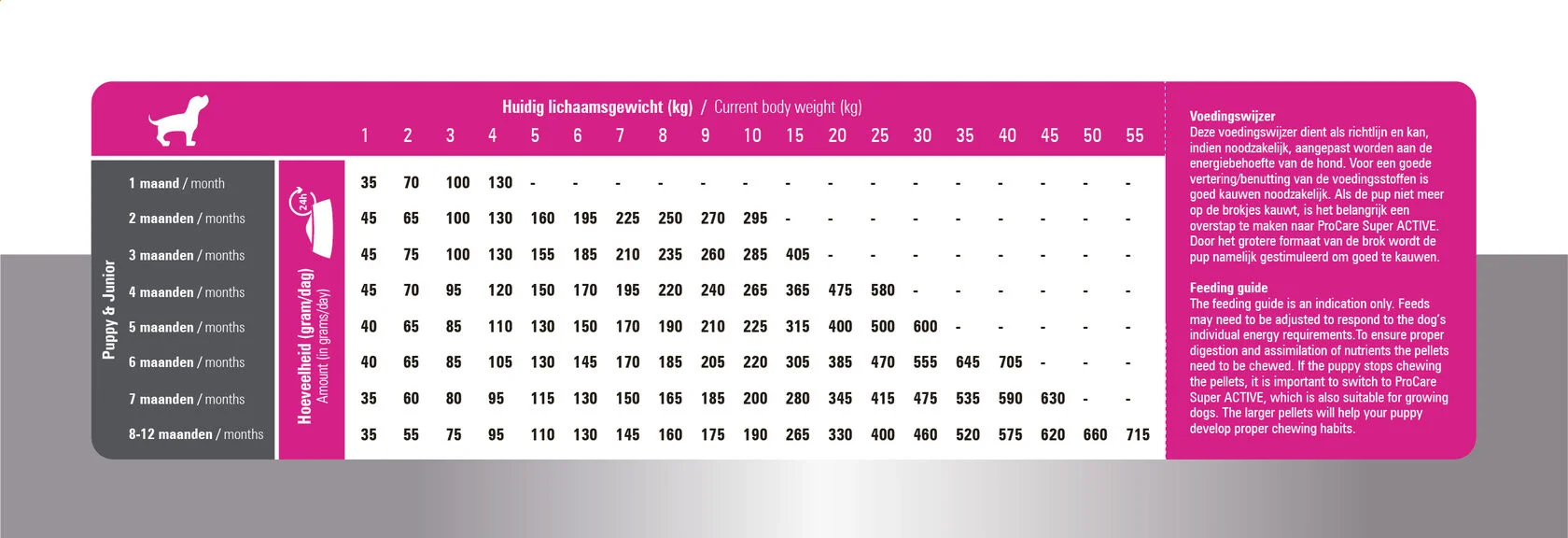 ProCare Grainfree Puppy & Junior Daily Care е висококачествена пресована храна без зърнени съставки, специално предназначена за кученца и млади кучета, на възраст от около 4 седмици до 12 месеца. Тази пълноценна храна допринася за здравословен растеж, силна имунна система и оптимално развитие на костите и ставите.