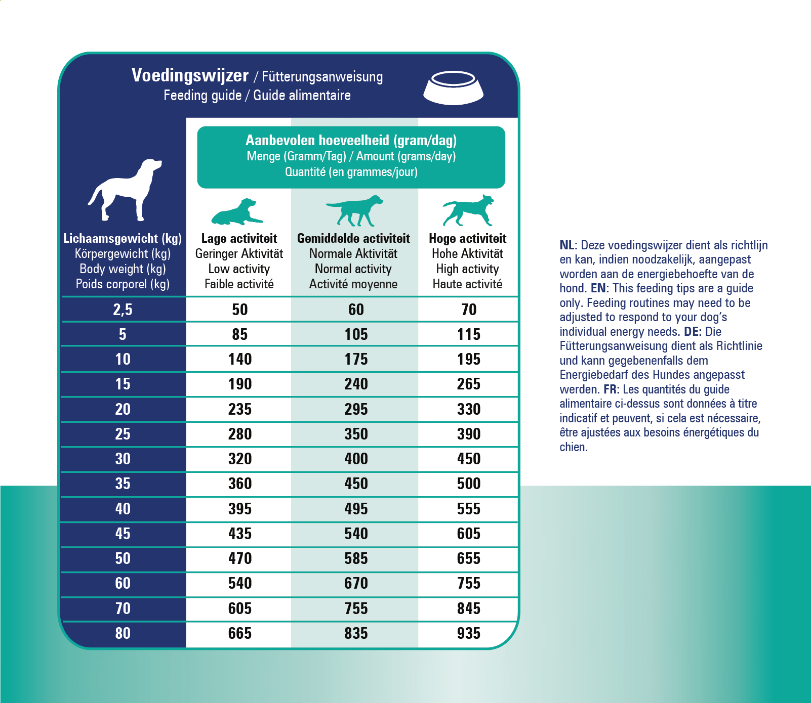 Състав: ориз, дехидратиранo патешко месо (26,0%), масло от сьомга (5,0%), телешка мазнина, птича мазнина, изсушена пулпа от цвекло, ленено семе, инулин (0,5%), хидролизиран черен дроб. Аналитични съставки: влага 8,0%, суров протеин 23,0%, сурова мазнина 15,0%, сурова пепел 7,3%, сурови влакнини 2,7%, линолова киселина 1,7%, EPA & DHA 0,38%. Минерали: калций 1,2%, фосфор 1,0%, калий 0,6%, магнезий 0,1%, натрий 0,35%. Добавки/kg: витамини: витамин A (3a672a) 10 000 IU, витамин D3 (3a671) 875 IU, витамин E (3a700) 335 mg, желязо (3b103) 63 mg, йод (3b202) 1 mg, мед (3b405) 11 mg , манган (3b502) 23 mg, цинк (3b605) 110 mg, селен (3b801) 0,13 mg.
