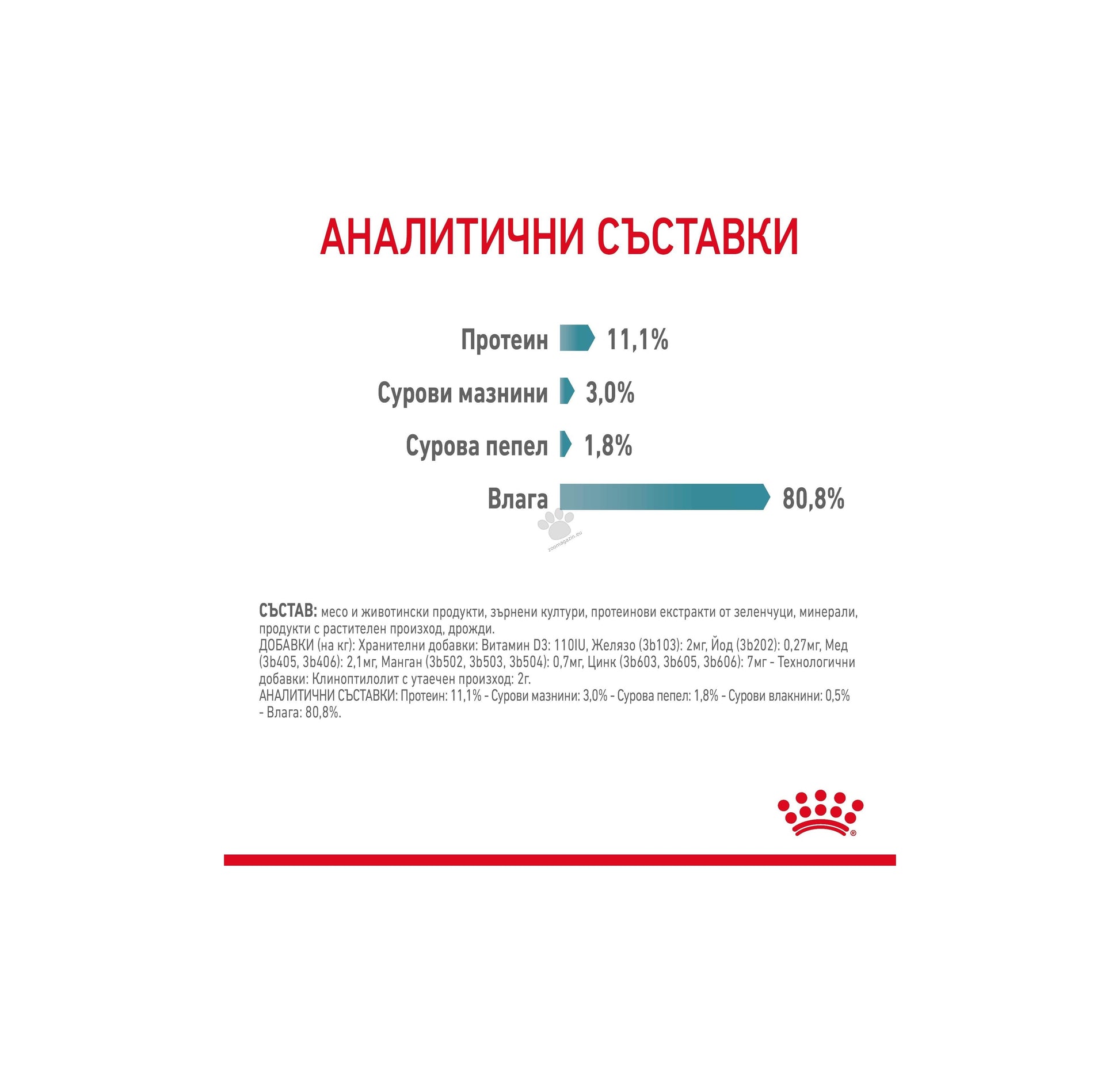 АНАЛИТИЧНИ СЪСТАВКИ: Протеин: 11,1% - Сурови мазнини: 3,0% - Сурова пепел: 1,8% - Сурови влакнини: 0,5% - Влага: 80,8%.