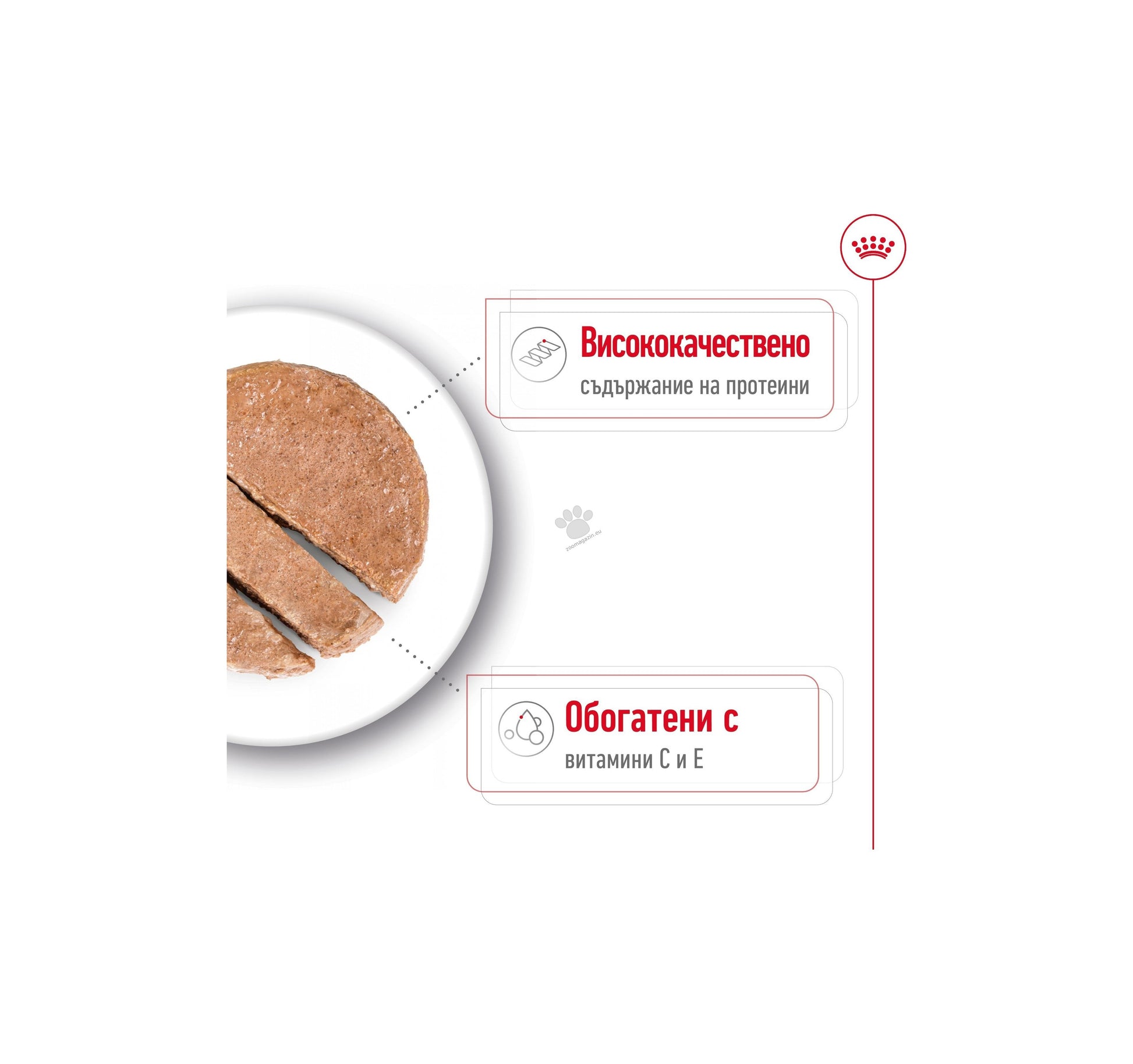 СЪСТАВ: месо и животински продукти, зърнени култури, минерали, продукти с растителен произход, масла и мазнини, дрожди. ДОБАВКИ (на кг): Хранителни добавки: Витамин D3: 160IU, Витамин C: 30мг, Витамин E: 140мг, Желязо (3b103): 8мг, Йод (3b202): 0,35мг, Мед (3b405, 3b406): 2,8мг, Манган (3b502, 3b503, 3b504): 2,6мг, Цинк (3b603, 3b605, 3b606): 26мг - Технологични добавки: Клиноптилолит с утаечен произход: 2г. АНАЛИТИЧНИ СЪСТАВКИ: Протеин: 8,7% - Сурови влакнини: 0,5% - Сурови мазнини: 5,4% - Сурова пепел: 2,0% - Влага: 79,7%. УКАЗАНИЯ ЗА ХРАНЕНЕ: виж таблицата. За партидния номер, идентификационен номер на фабриката: вижте на опаковката. Най-добър преди: вижте на опаковката. Да се съхранява на сухо и прохладно място. По всяко време трябва да има вода на разположение.