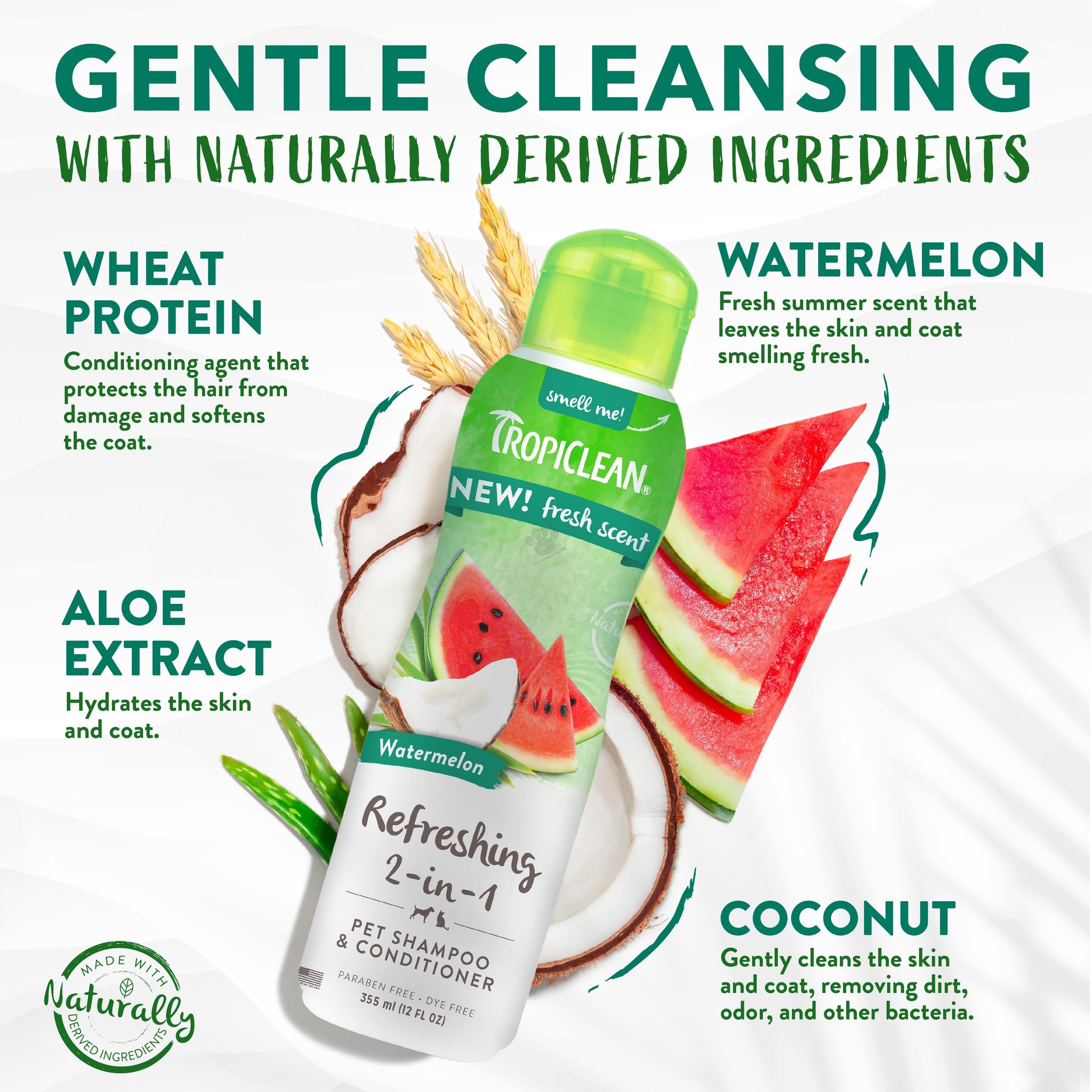 TropiClean Watermelon Refreshing 2-in-1 Pet Shampoo & Conditioner нежно почиства и овлажнява кожата и козината на домашния любимец в луксозна пяна, за да помогне за отпускане на заплетените косми за по-лесно разресване, оставяйки козината мека и здрава. Продуктите за домашни любимци TropiClean не са тествани върху животни.