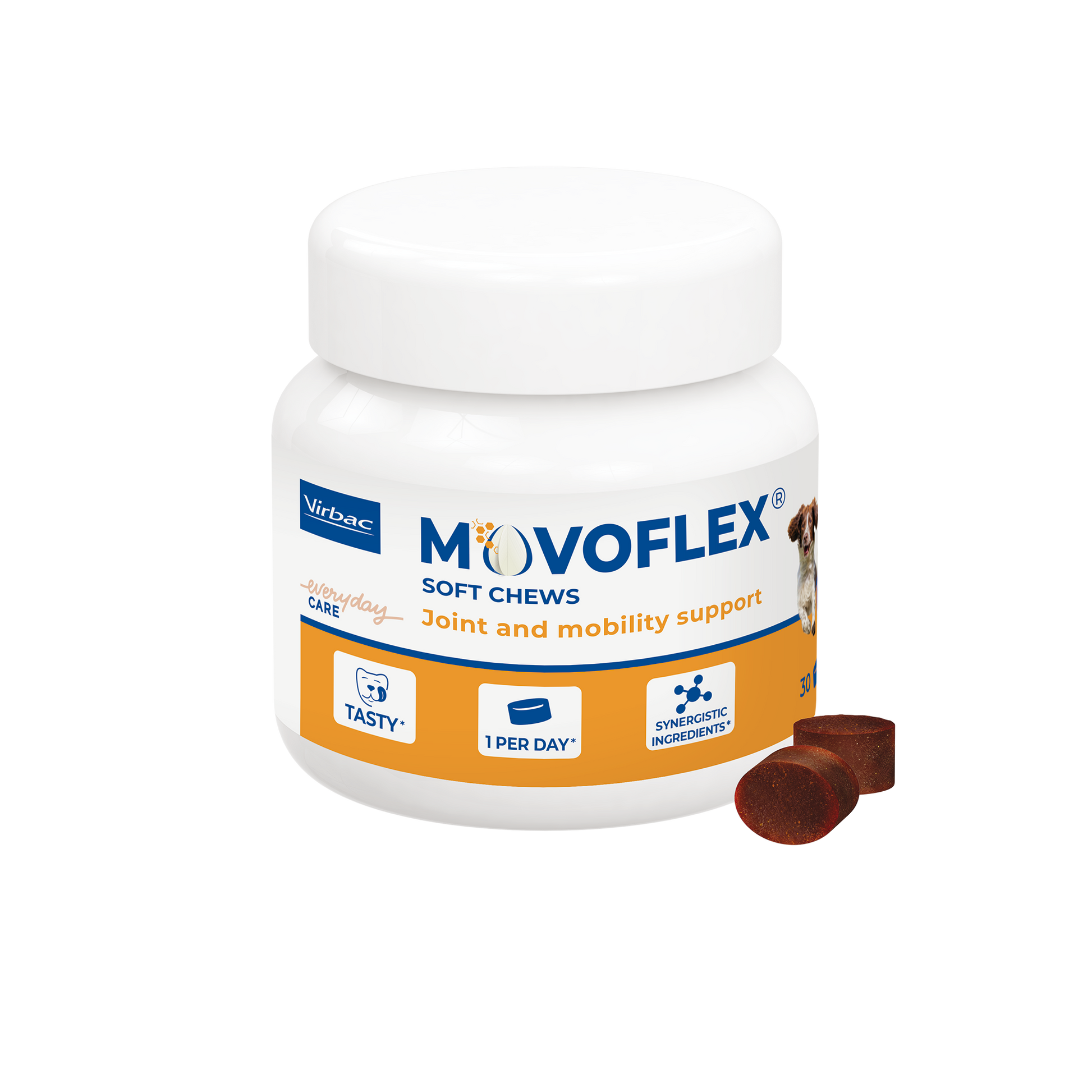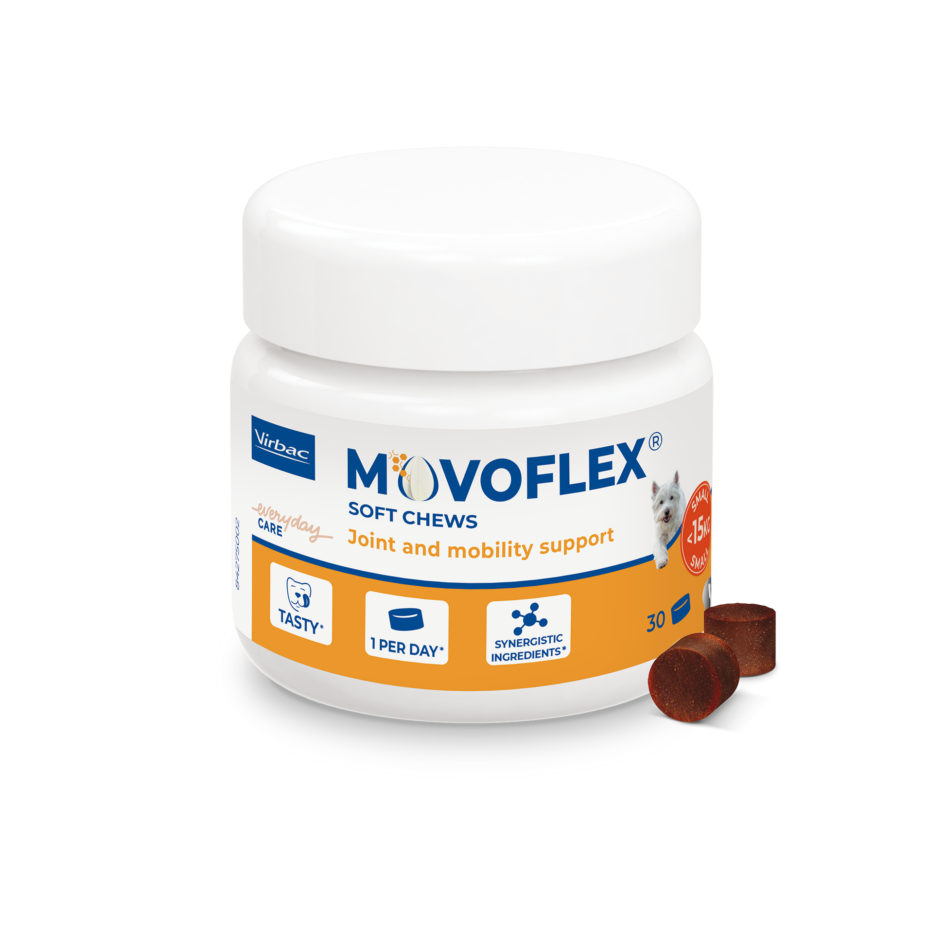 MOVOFLEX® Soft Chews – меки дъвчащи хапки за кучета, създадени със синергична комбинация от съставки, които подхранват и защитават ставите.Подпомагат здравето на ставите, подвижността, структурата и гъвкавостта на вашето куче. Собствениците на домашни любимци съобщават за подобрение в подвижността само след 7 дни.