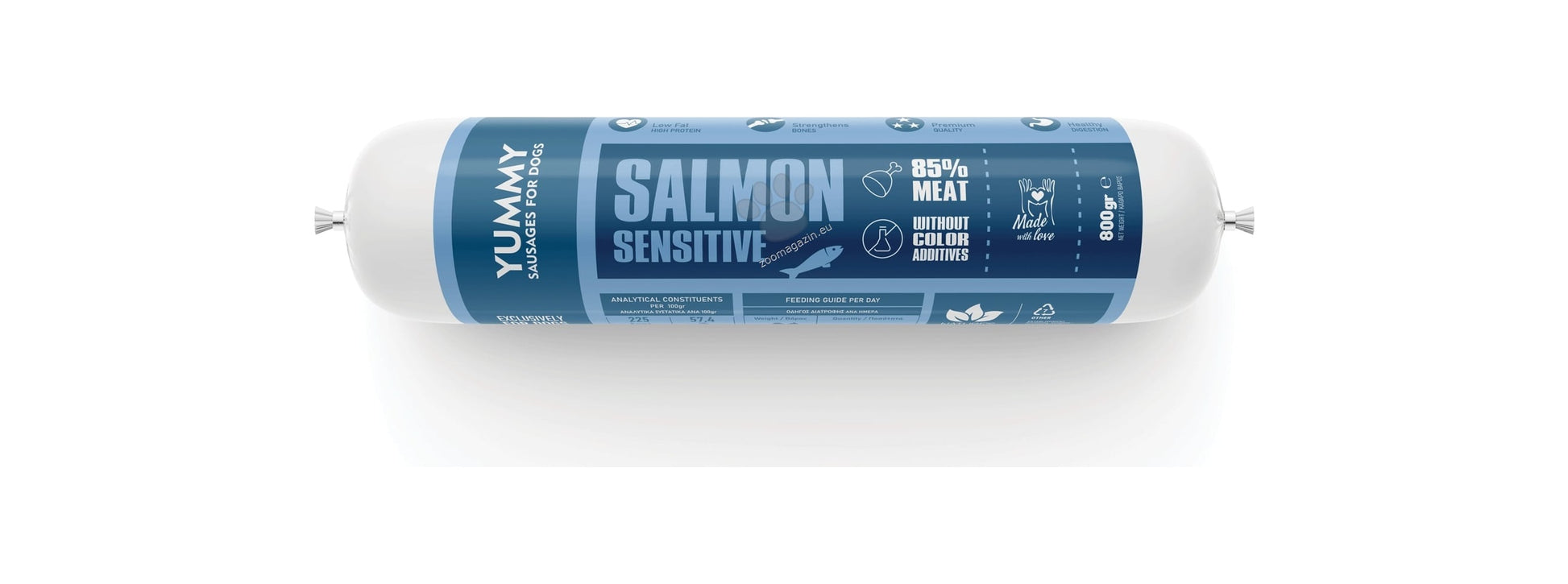 Саламчета за кучета със сьомга, сардини и пилешко месо, подходящи за човешка консумация. Salmon Sensitive Yummy от Real Nature’s Food е направен от селектирана сьомга, сардини, пилешко месо и натурален бульон от сьомга. Сьомгата и сардините са отлична храна с уникална хранителна стойност. Тя е полезна за мозъка, като подпомага неговото развитие. Като изключително висококачествен протеин, сьомгата и сардините са много ефективни и при заздравяването на рани. Наличието на Омега 3 поддържа кожата здрава, а козината блестяща, като в същото време подобрява имунната система. Salmon Sensitive Yummy е произведен от пресни и чисти съставки, с месо, подходящо за човешка консумация.